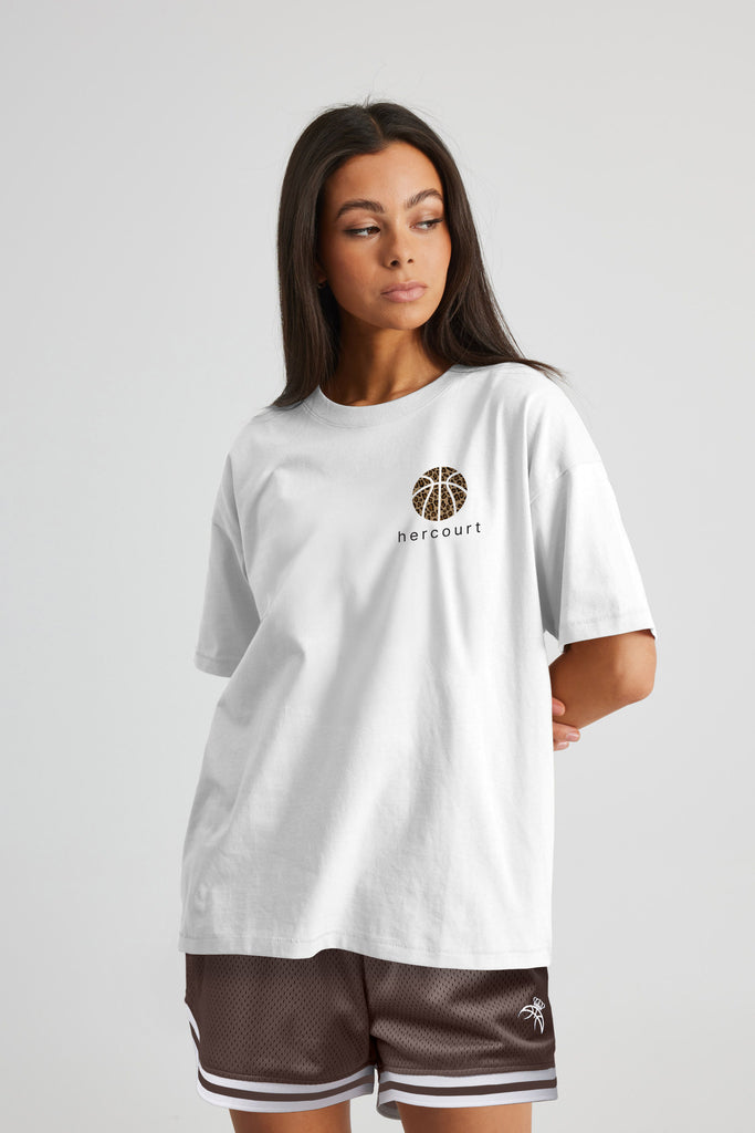 The Hercourt Dark Cheetah Tee is the perfect pairing piece for our Dark Cheetah Shorts- a clean white tee featuring a bold cheetah-print basketball icon and minimalist Hercourt text. It’s simple, elevated, and adds just the right amount of personality without overpowering your fit.